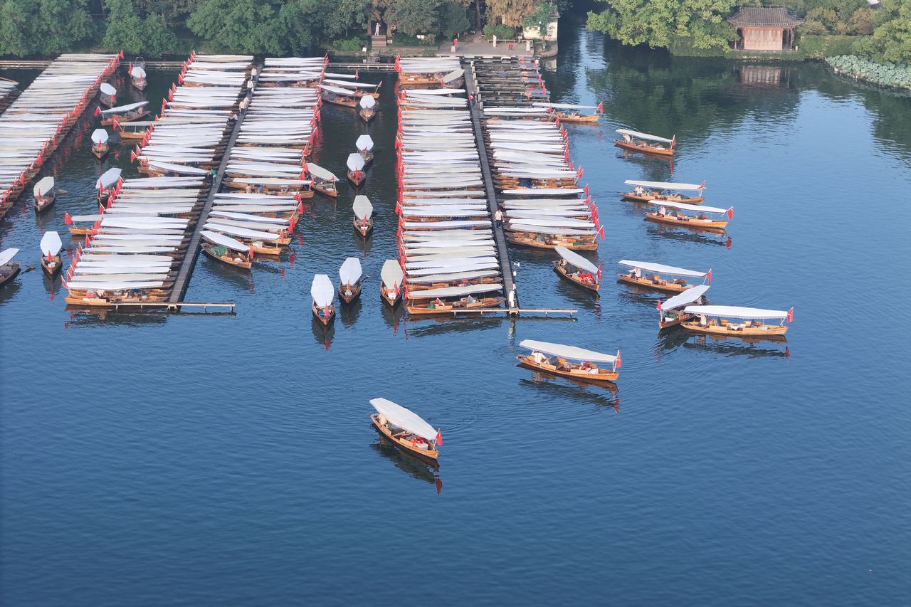 西湖手划船挂上国旗迎国庆。里尔 摄