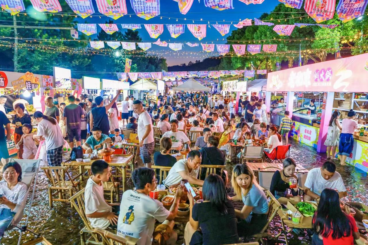 挽起裤脚,踩在没过脚踝的八都溪中,两侧是64家特色摊位,小吃香气四溢,非遗文化产品琳琅满目。游客们边玩水边品美食,一派欢乐景象。