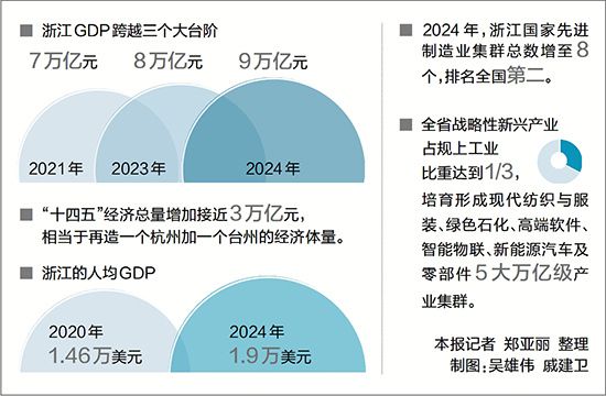 五年来,浙江经济总量节节攀升,连续跨越7万亿元、8万亿元、9万亿元三个大台阶,稳居全国第四。