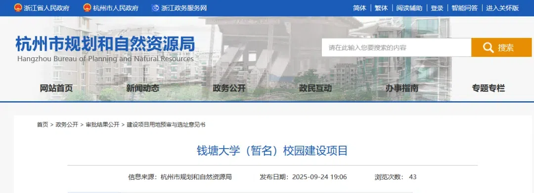 同年6月,杭州市行政审批服务管理办公室网站刊发一则由杭州市规划和自然资源局供稿的文章《钱塘大学获批!为高等教育发展注入强劲动力》显示,钱塘大学用地已于5月17日获得省政府批准,为钱塘大学落地建设筑牢了土地要素根基。