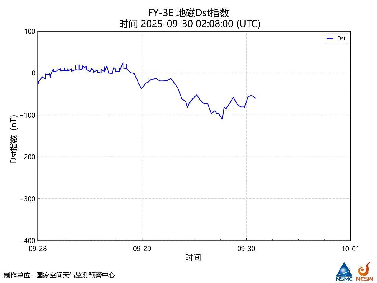 风云三号E星的天基地磁探测数据显示,中低纬度区域的Dst指数一度下探到超过-100nT。