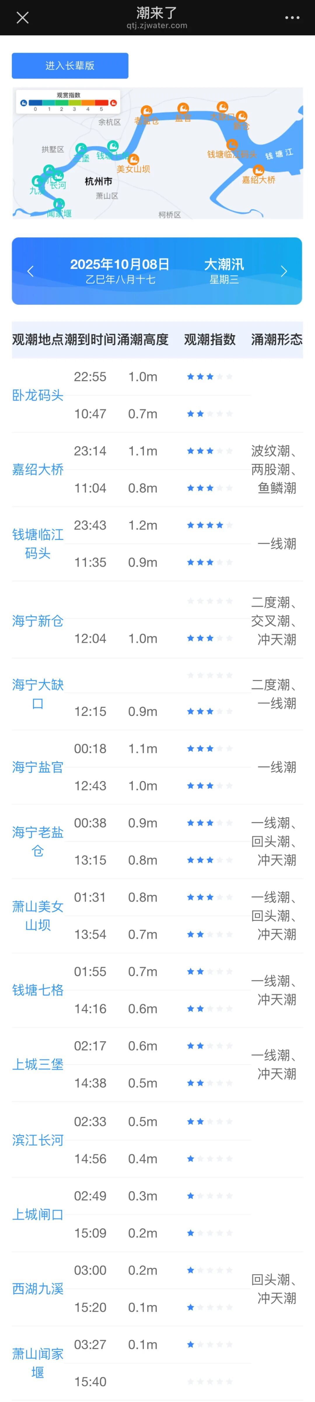 注:1.潮到时间依次为夜潮、日潮时间,0点以后为次日时间。2.观潮指数由低到高分为一星到五星,其中三星以下不推荐观潮。