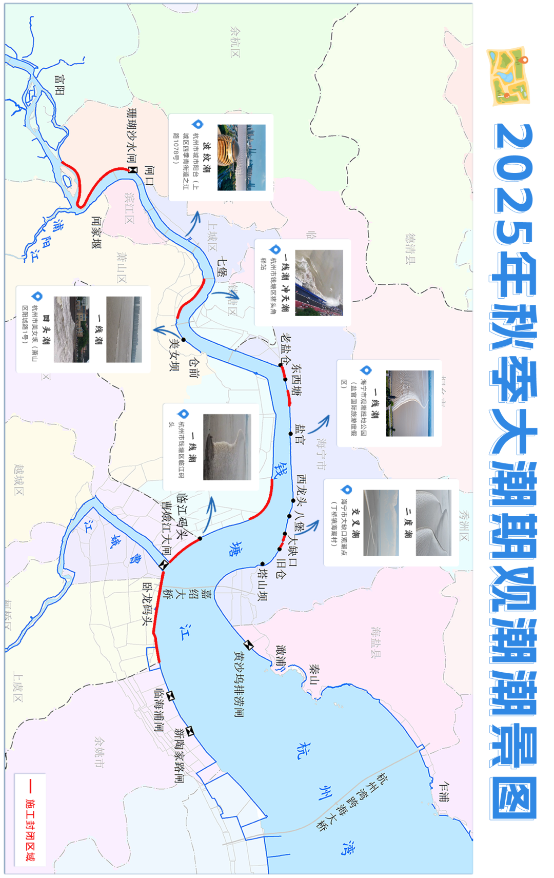 近期,钱塘江沿岸有多处施工工地,除上述推荐点位外,建议前往其他观潮点的游客提前核实开放信息,确保出行安全顺利。