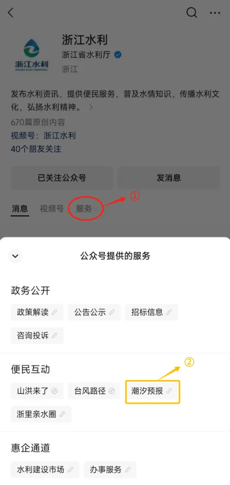 进入浙江水利微信公众号,①点击“服务”,②选择“便民互动——潮汐预报”;或在微信后台回复“钱塘江潮汛、钱塘江潮、钱塘江、潮水、潮汐、 潮”等关键词获取。