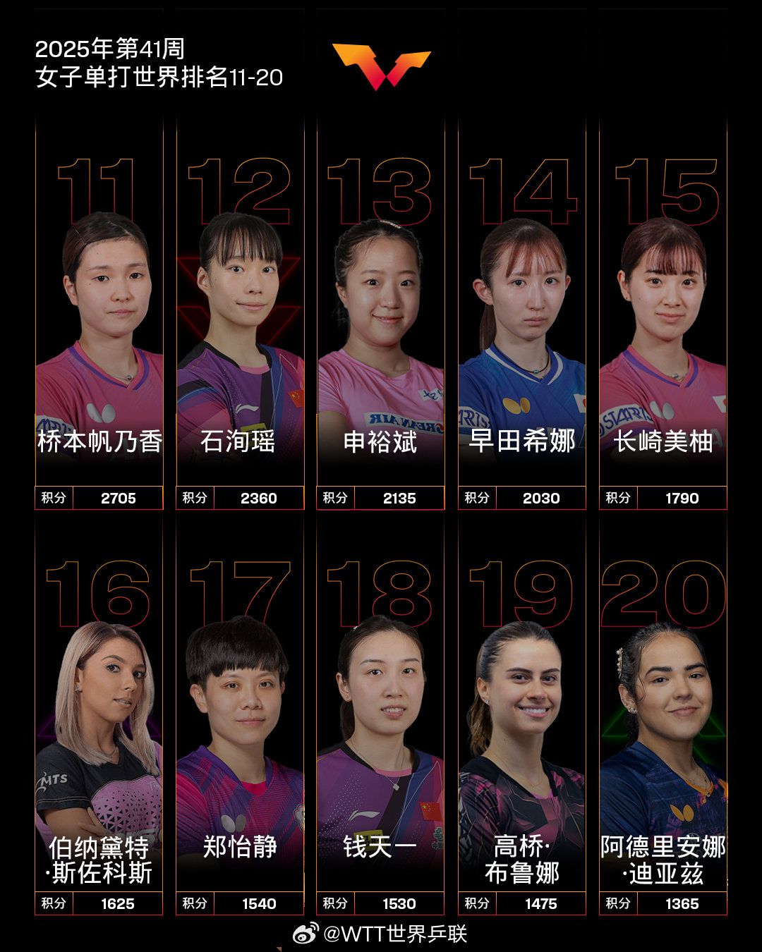 WTT中国大满贯女单四强申裕斌排名上升4个名次位列第13;八强朱雨玲排名上升1个名次位列第6;八强朱芊曦排名上升11个名次位列第24;十六强李昱谆排名上升21个名次位列第47,刷新个人职业生涯排名新高;三十二强汉娜·高达排名上升2个名次位列第23,刷新个人职业生涯排名新高;三十二强叶伊恬排名上升11个名次位列第48,刷新个人职业生涯排名新高;三十二强安娜·赫尔希排名上升22个名次位列第54,刷新个人职业生涯排名新高;三十二强朱思冰排名上升32个名次位列第68,刷新个人职业生涯排名新高。