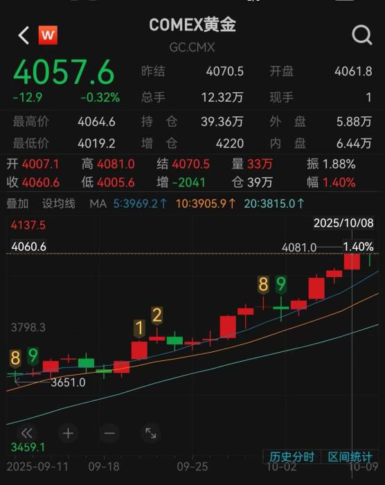 截至10月8日,COMEX黄金最高触及4081美元/盎司,创下历史新高。