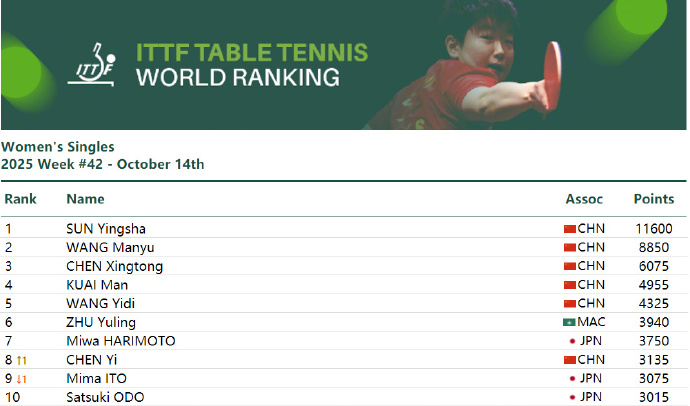 10月14日,国际乒联更新2025年第42周世界排名:女单方面,孙颖莎11600分连续第170周霸榜第一,王曼昱8850分排名第二,陈幸同6075分排名第三。