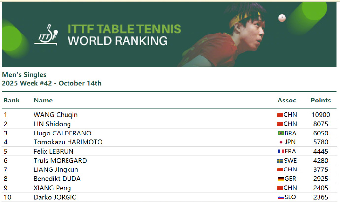 男单方面,王楚钦10900分排名第一,林诗栋8075分排名第二,雨果6050分排名第三。