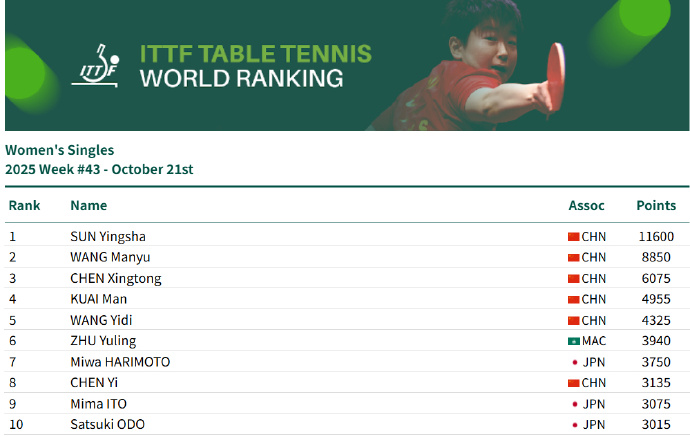 10月21日,国际乒联公布2025年第43周排名:女单方面,孙颖莎11600分连续第171周霸榜第一,王曼昱8850分排名第二,陈幸同6075分排名第三。