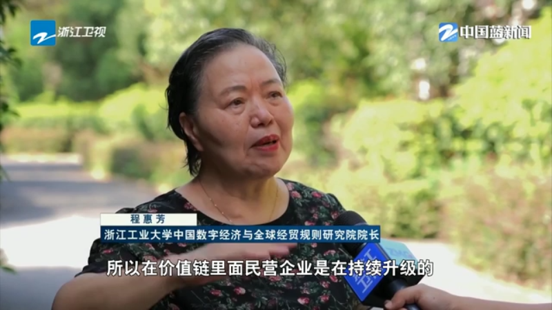 浙江工业大学中国数字经济与全球经贸规则研究院院长 程惠芳:浙江的民营企业从产品“走出去”,企业“走出去”,生产“走出去”,再到投资的国际化,还到技术创新的国际化,所以在价值链里面民营企业是在持续升级的,这样我们才有话语权。