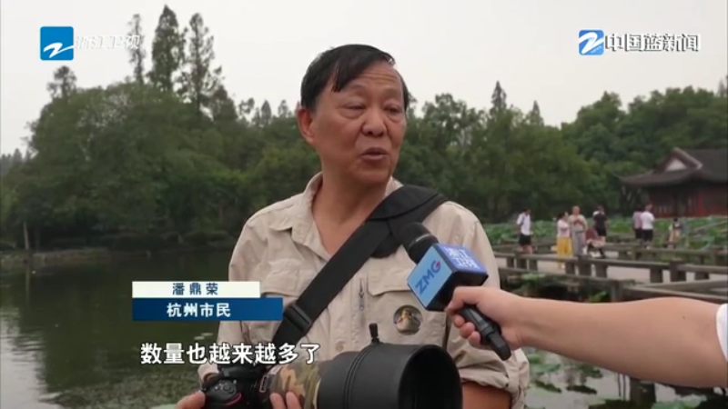 杭州市民 潘鼎荣:这五年来我拍到的鸟类品种也越来越多,数量也越来越多了,这主要生态环境一年比一年好,这是分不开的。