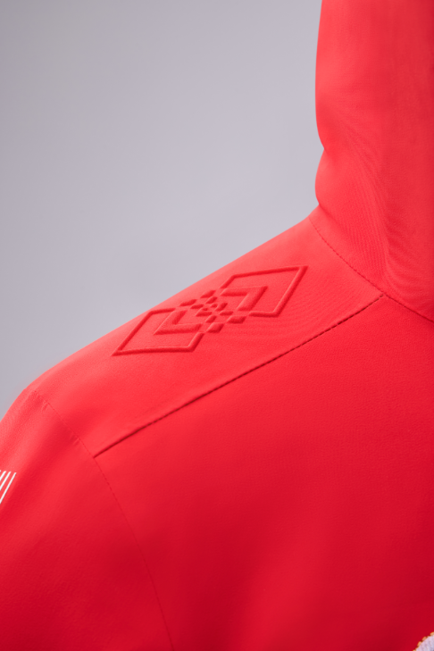 领奖服陪伴运动员登上最高领奖台,是体育精神与竞技实力的展现,同时也向世界展现中华优秀传统文化。2026年米兰冬奥会中国体育代表团领奖服,在肩部、袖口等部位采用了传统吉祥寓意纹样——“双胜纹”,该纹样由两个菱形交叠穿插而成,蕴含着胜利、祥瑞等美好寓意,并在此基础上衍生出“双胜雪花纹”,用于领口和内里玄武岩远红外印花等部位,同时巧妙地融入领奖服背后CHINA字母纹饰,在夜晚光照后CHINA也能清晰可见,以此寄托着对中国冬奥健儿斩获更多胜利的美好祝愿。
