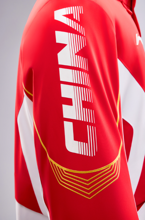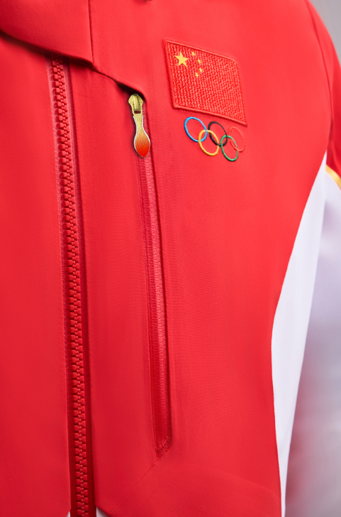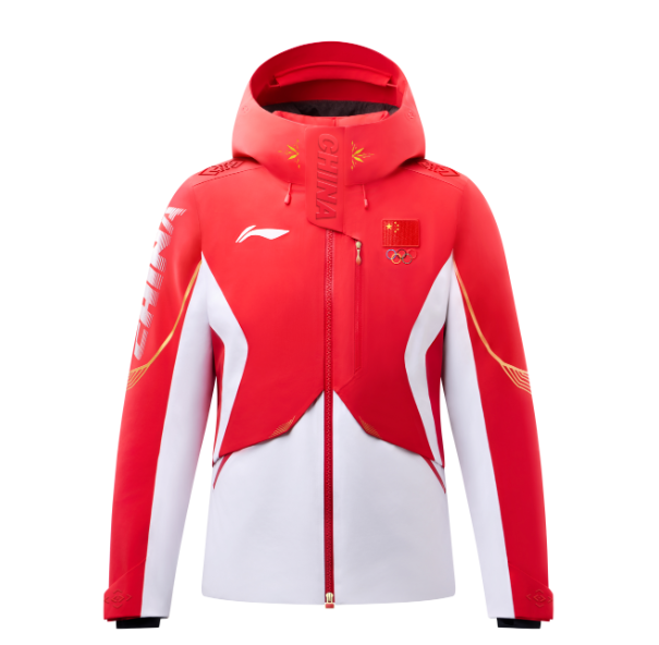 2026年米兰冬奥会中国体育代表团领奖装备,红、白两色为主色调, “中国红”充分彰显中国文化元素,在正面勾勒出象征着五角星的线条;“雪山白”灵感源自冬季运动场景,也融入了东方审美里的留白意境,并在侧身勾勒出李宁品牌标识线条,同时搭配以雪道为原型的金色流线型线条为点缀,全身以上红下白的色彩拼接,凸显中国运动健儿的挺拔身姿。
