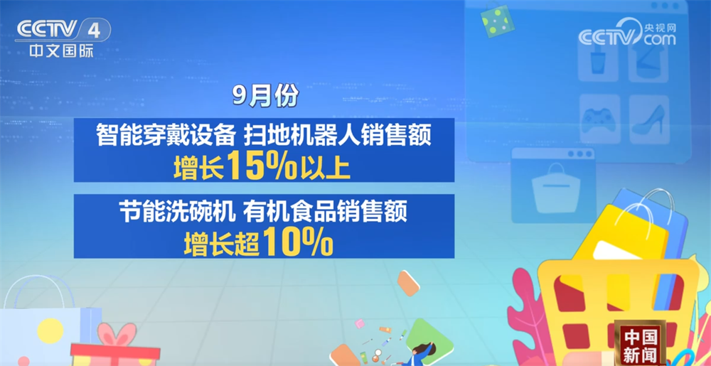 智能、绿色等新型消费持续壮大。9月份,智能穿戴设备、扫地机器人销售额增长15%以上,节能洗碗机、有机食品销售额增长超10%。