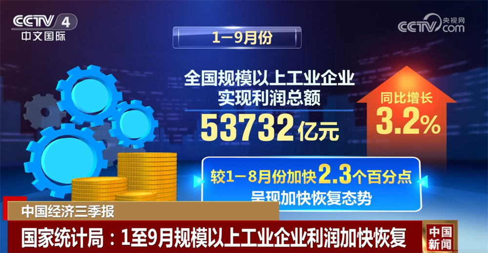 国家统计局发布的数据显示:1—9月份,随着更加积极有为的宏观政策落地落实,新经济增长点培育壮大,全国规模以上工业企业实现利润总额53732亿元,同比增长3.2%,较1—8月份加快2.3个百分点,呈现加快恢复态势。