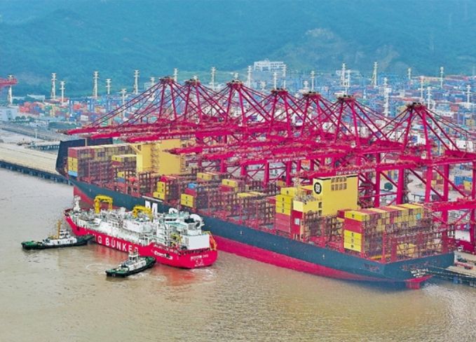 10月31日清晨,MSCELANA轮在宁波舟山港穿山港区完成5000立方米的液化天然气(LNG)加注后缓缓驶离泊位,标志着今年宁波舟山港LNG国际航行船舶加注量突破20万立方米,稳居全国前三。 记者 李华 通讯员 吴梦凯 摄