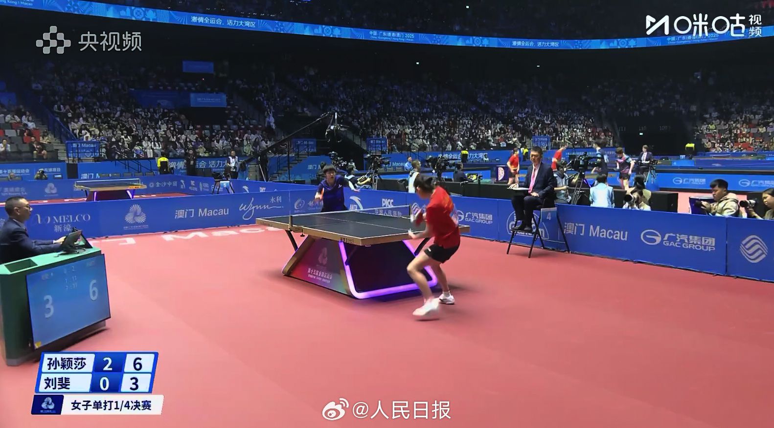 刚刚,第十五届全运会乒乓球女子单打1/4决赛,孙颖莎战胜对手刘斐,晋级女单四强。继续加油!