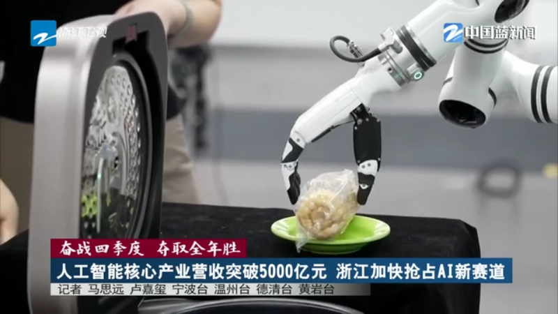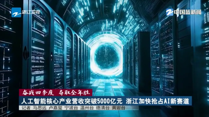 今年以来,浙江人工智能软硬件新产品和新技术不断亮相,人工智能科技创新与产业创新深度融合、持续推进。数据显示,前十月,全省人工智能核心产业营收突破5000亿元,增速超20%。来看今天的《奋战四季度 夺取全年胜》。