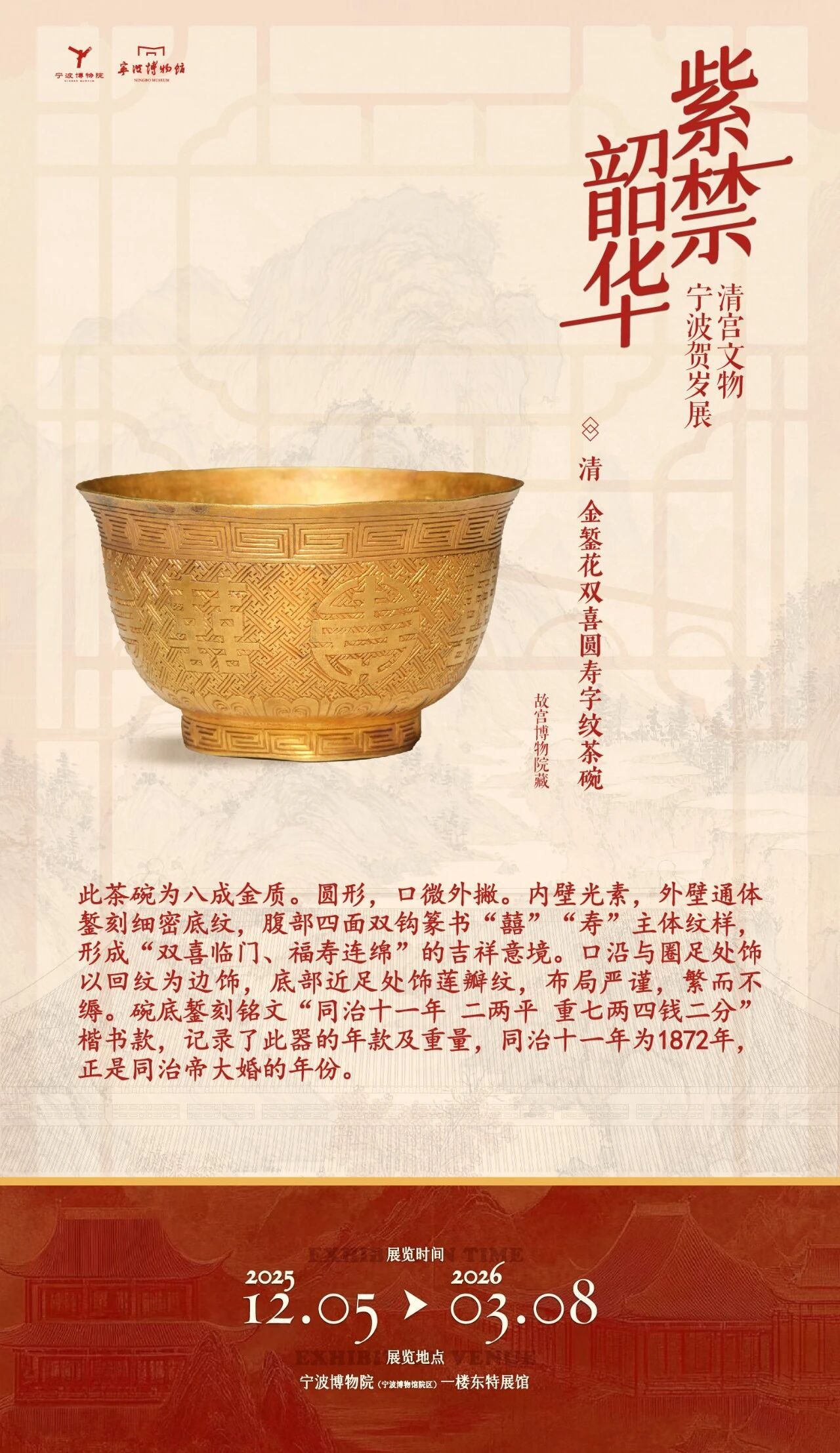 “紫禁韶华——清宫文物宁波贺岁”展依托故宫博物院、天津博物馆、沈阳故宫博物院的清宫文物珍藏,展览共展出文物185件(组),分设四大板块:“云裳之制”展现礼制织绣之美;“佳节器象”品味时节器用之意;“栖居意趣”领略空间营造之韵;“心印天地”探寻精神信仰之境。衣、食、住、信,共同勾勒出清代宫廷生活的艺术长卷,引领观众步入一幅充满仪式感与吉祥寓意的宫廷生活图景。