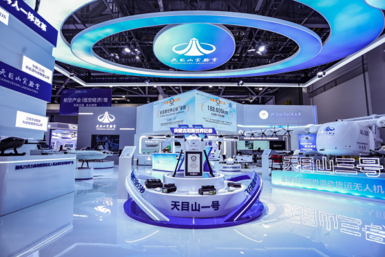 亮相博览会的“天目山一号”氢动力无人机创造了“氢燃料电池驱动的多旋翼无人机飞行的最长距离”吉尼斯世界纪录,成功完成了不间断飞行188.605公里(用时4小时17分55秒)的飞行挑战,已应用于高速巡检、油气管道巡查、新能源电站运维及海岛运输、城市交通管理及应急救援作业。