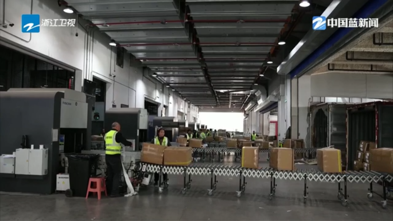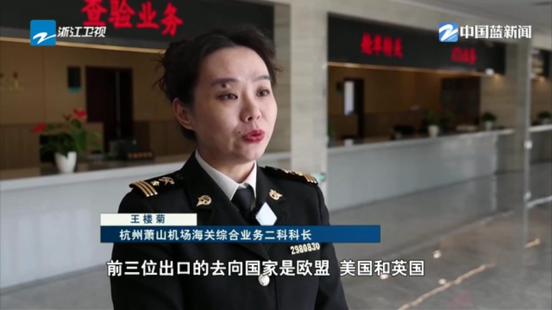 杭州萧山机场海关综合业务二科科长 王楼菊:前三位出口的去向国家是欧盟、美国和英国,主要以我们浙江比较有优势的一些日用消费品和服装这些品类为主。