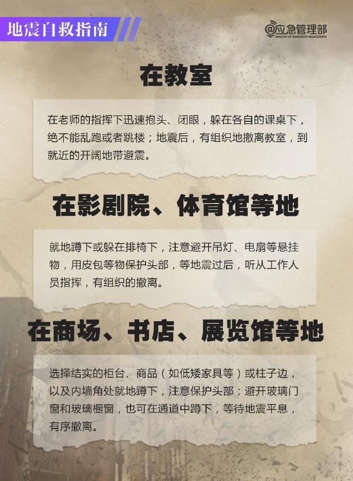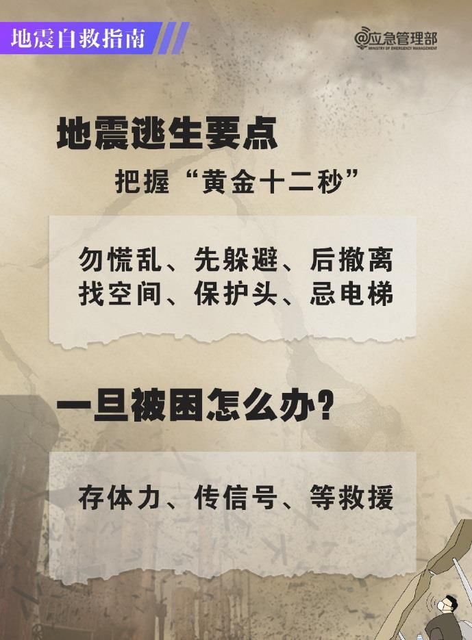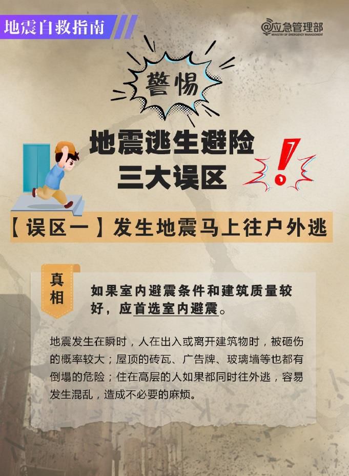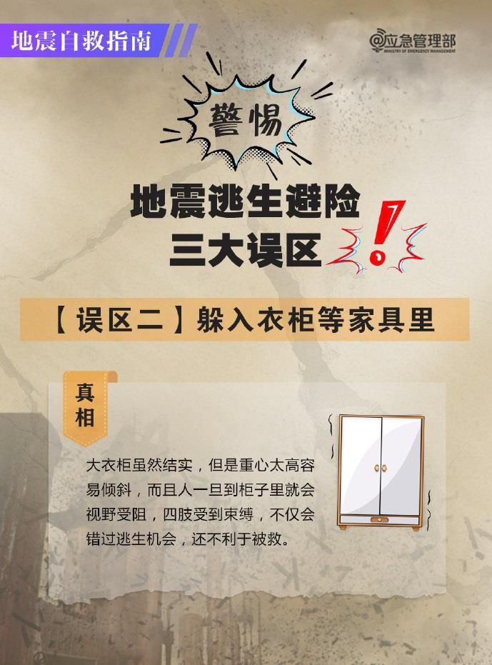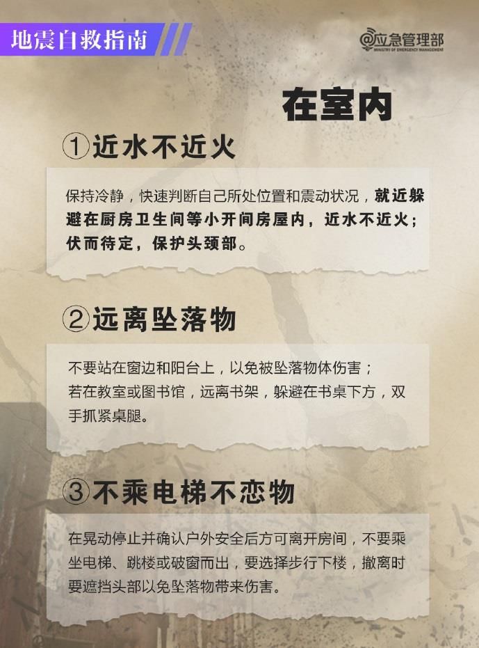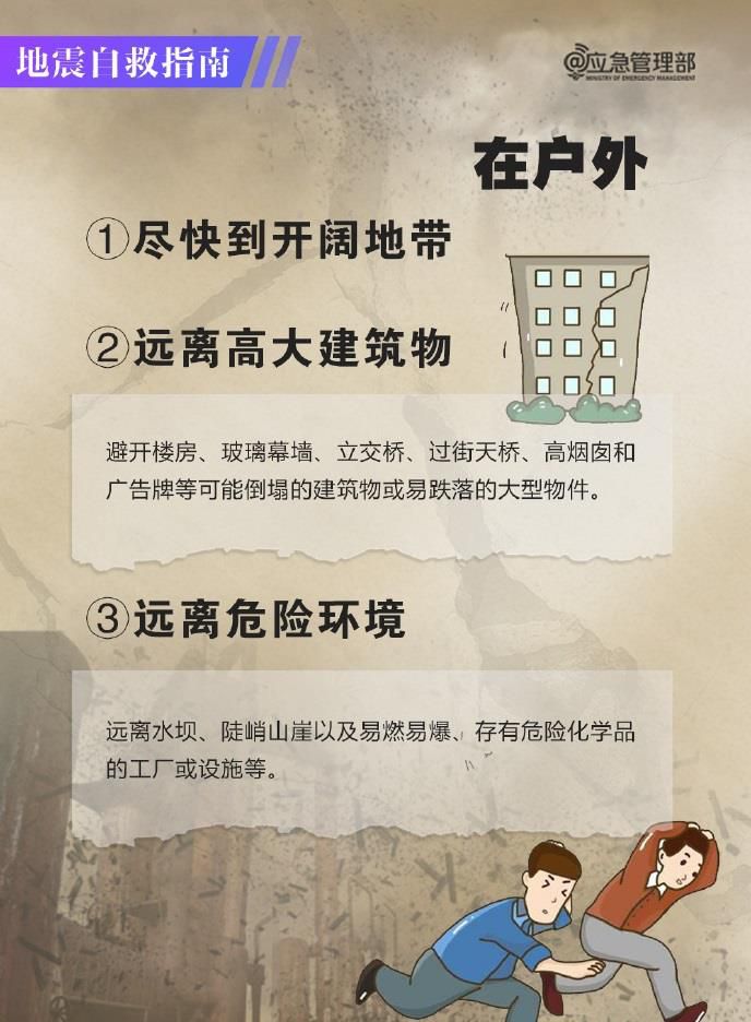 红色、橙色预警警报:收到预警后刻不容缓,远离阳台、电梯间、窗户附近,迅速判断自身所处环境,尽快赶到室外空旷地带,若来不及离开室内,一定要第一时间护住头部,屈身降低重心,躲到开间小、有承重墙的房间去,并抓住牢固的物体,防止晃动,直到震感结束,迅速转移到室外。