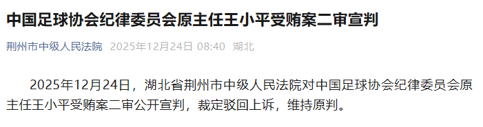 2025年12月24日,湖北省荆州市中级人民法院对中国足球协会纪律委员会原主任王小平受贿案二审公开宣判,裁定驳回上诉,维持原判。