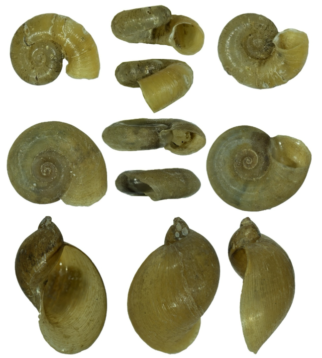 碧塔海3个淡水螺特有新种:碧塔盘螺(上)、日月旋螺(中)和中甸萝卜螺(下)。新华社发