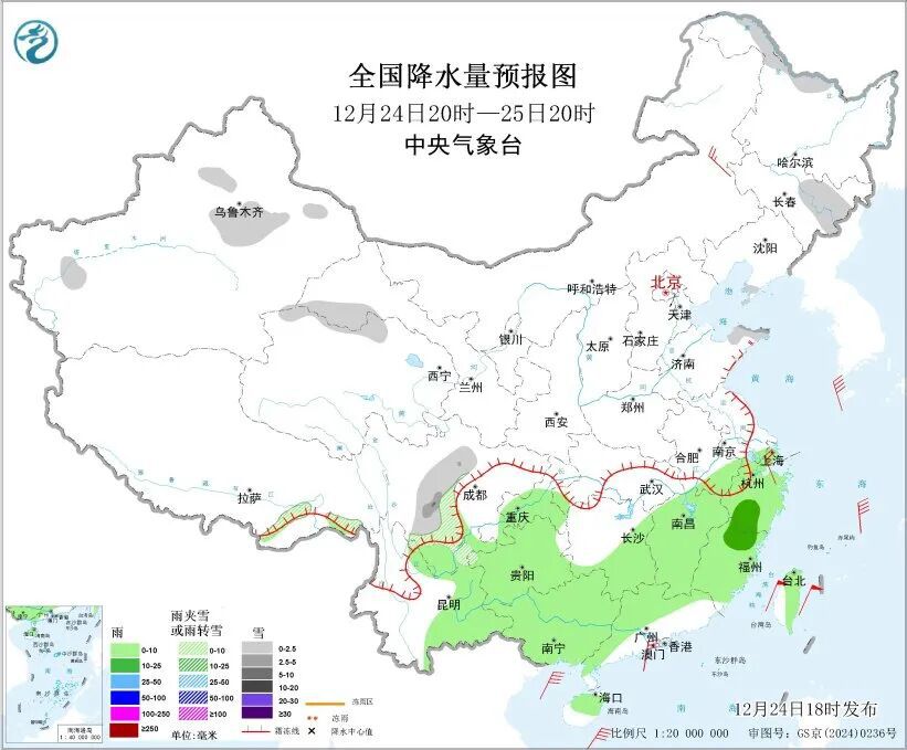 24日20时至25日20时,新疆沿天山地区和东部、川西高原东部和南部、山东半岛北部、辽东半岛南部等地部分地区有小雪或雨夹雪,其中,山东半岛东北部、川西高原南部等地部分地区有中到大雪。江南大部、华南北部和西部、西南地区中东部、台湾岛等地部分地区有小雨,局地中雨。