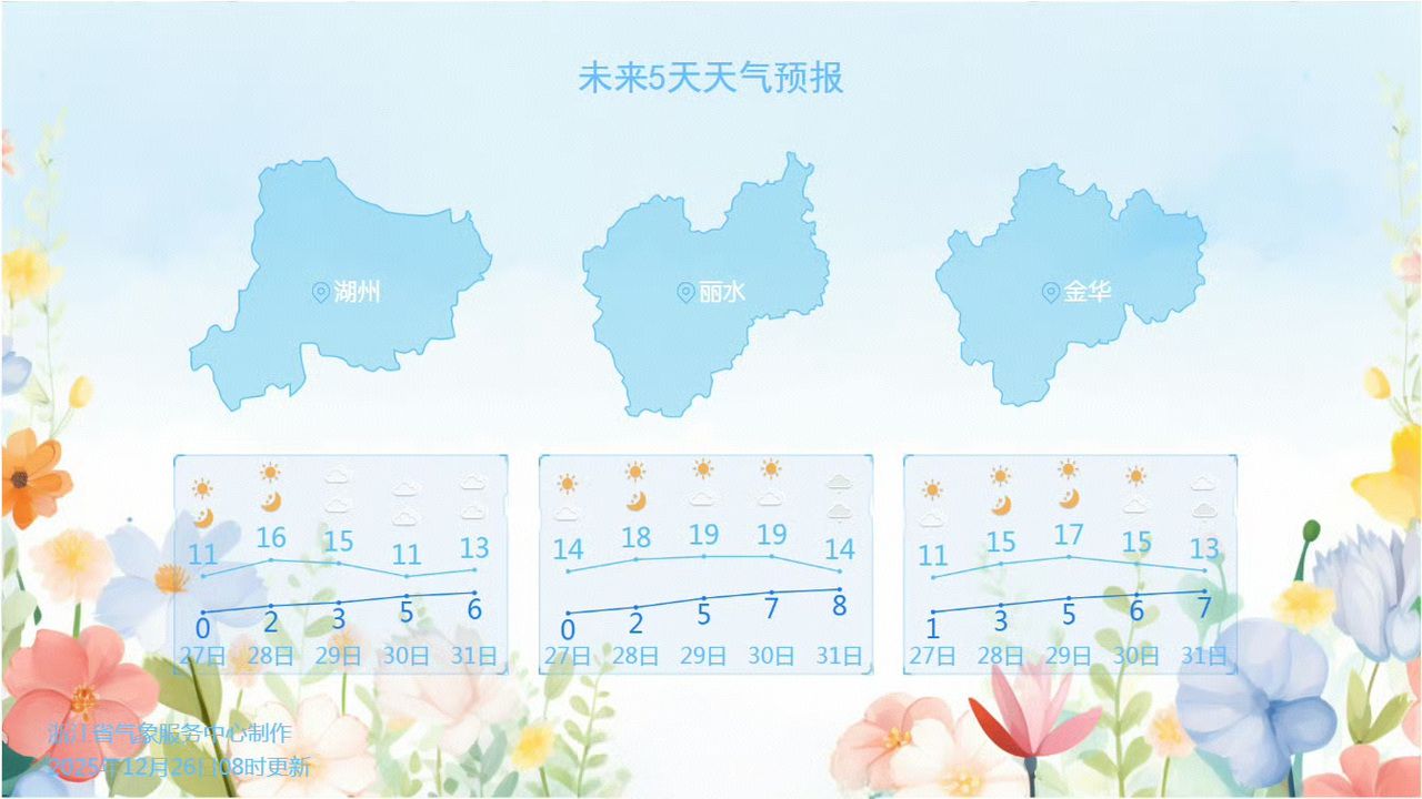 不过,大家肯定对昨天(12月26日)的寒冷心有余悸。受冷空气影响,昨天早晨,除沿海地区外,全省大部地区最低气温都跌破了冰点。湖州(-0.9度)、杭州(-0.5度)、金华(0.4度)、丽水(-0.8度)都创下半年以来新低。