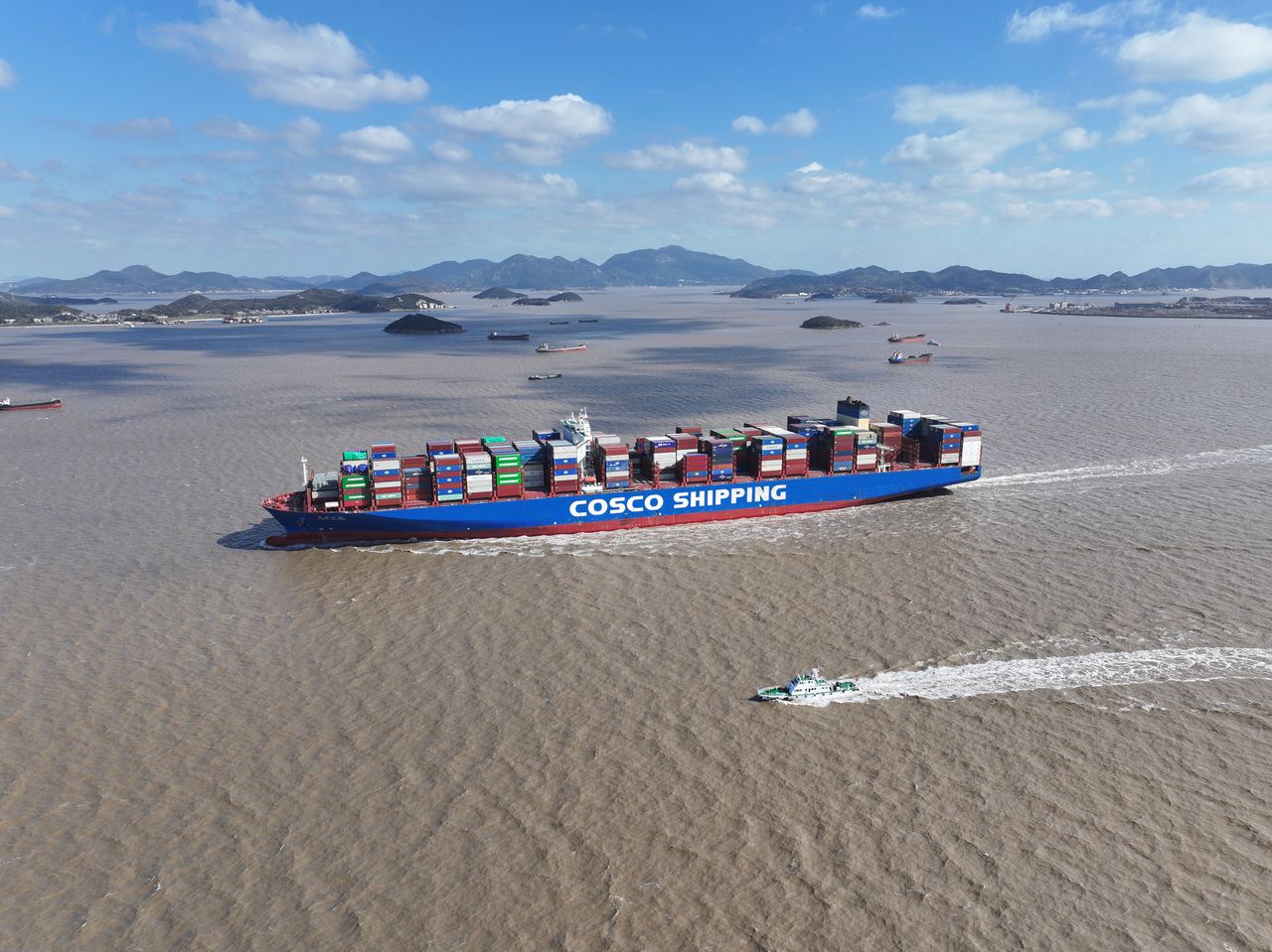26日,全球最大等级、20万吨级集装箱船“中海环球”轮,顺利通过新扩建的条帚门航道,靠泊在宁波舟山港梅山港区,这标志着该航道正式具备超大型船舶通航能力,并进入实质性运行阶段。