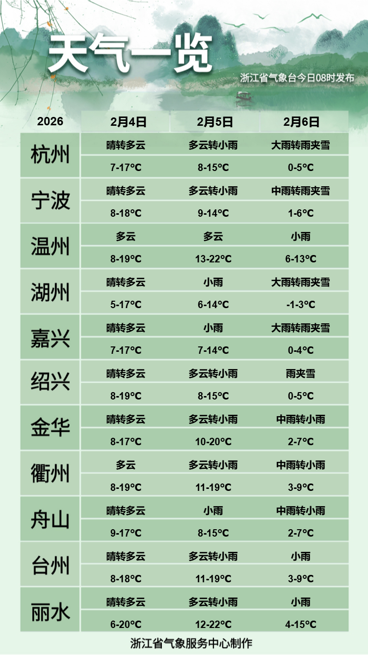 5日夜里起全省阴有雨,浙北地区中雨,部分大雨;6日中午至夜里浙中北部分地区将先后转雨夹雪或雪,浙西北高山区有大到暴雪,浙南山区局部有冻雨;7日上午起全省雨雪渐止转阴天,但浙中南山区局部仍有雨夹雪或雪。