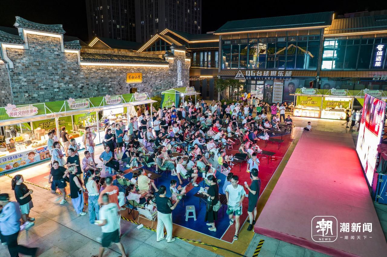 永康市大司巷特色文化街区夜市上,市民们在观看“浙BA”赛事。图 / 金思成 卢斌 陈业 摄