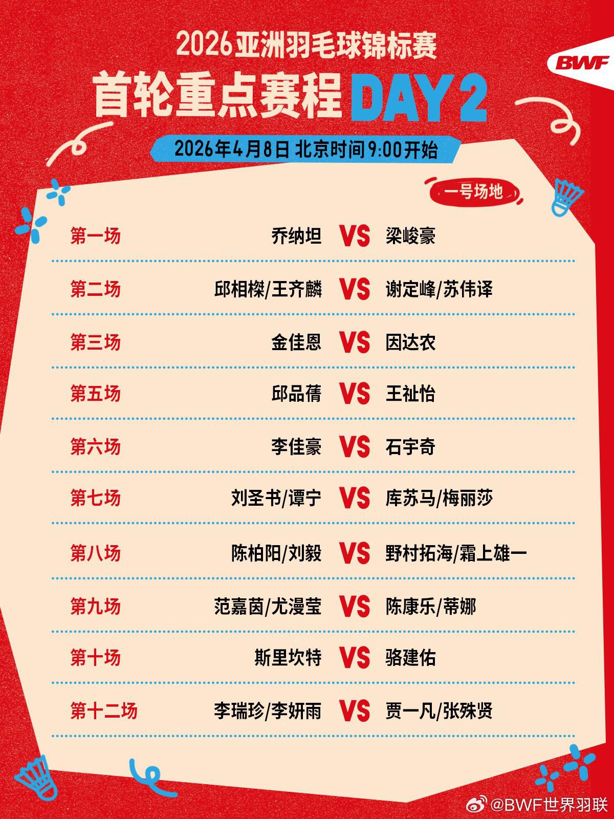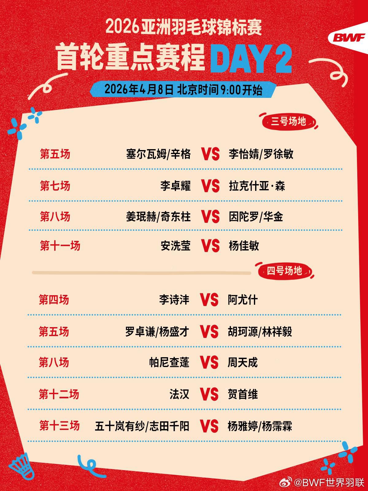 今天(8日),2026年亚洲羽毛球锦标赛继续于北京时间9时开打。焦点战:石宇奇vs李佳豪、李诗沣vs阿尤什、刘圣书/谭宁vs库苏马/梅丽莎、何济霆/任翔宇vs万炜聪/郑凯文等 。