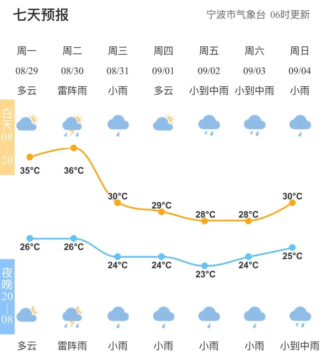 高温反扑,气温多变从市气象台的预报看,今天多云,北部地区午后局部有阵雨或雷雨;经历短暂降温后,副高又来争夺天气控制权,今明两天,宁波的最高气温将重新回到35℃左右。请注意做好防暑降温工作,并节约用水。