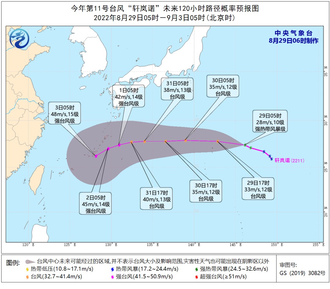 据中央气象台消息,今年第11号台风(热带风暴级)“轩岚诺”于昨天下午生成。今天凌晨由热带风暴级加强为强热带风暴级,早晨5时其中心位于日本东京东南方约1100公里的西北太平洋洋面上。预计, “轩岚诺”将以每小时25-30公里的速度向偏西方向移动,强度逐渐增强。“轩岚诺”未来三天对我国海域无影响。