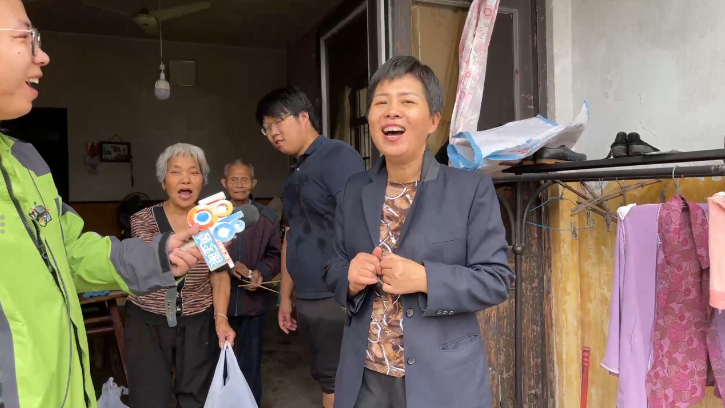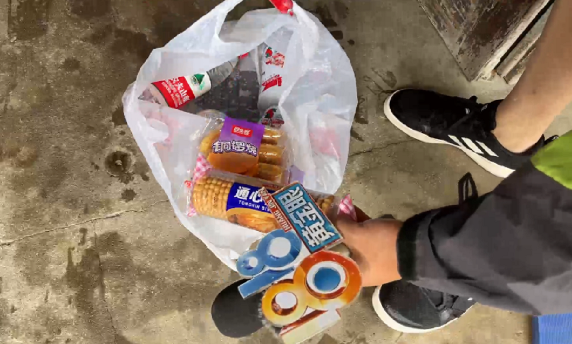 在返回的路上,记者发现,有一位大伯一直拿着物资袋站在门口,仿佛在等待什么。看到摄像机,大伯很激动地举起袋子跟记者说:“他们太好了!太感谢了!”