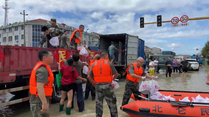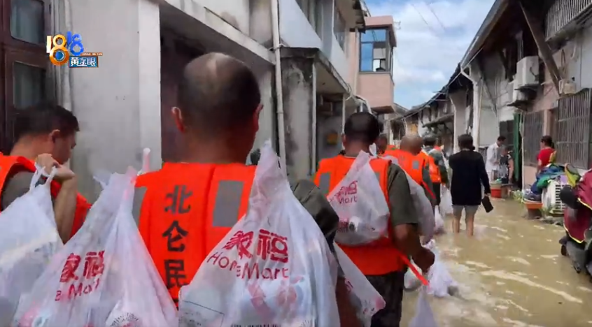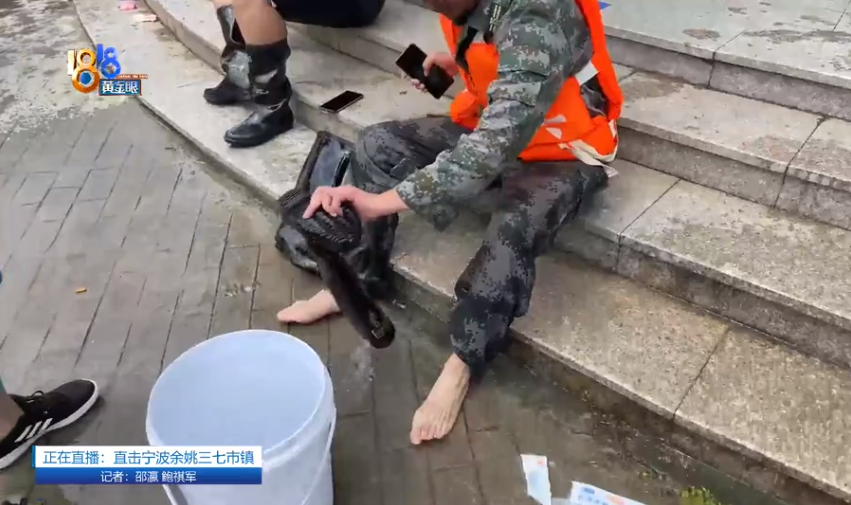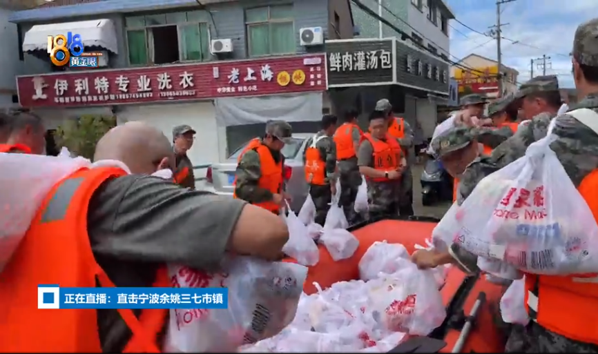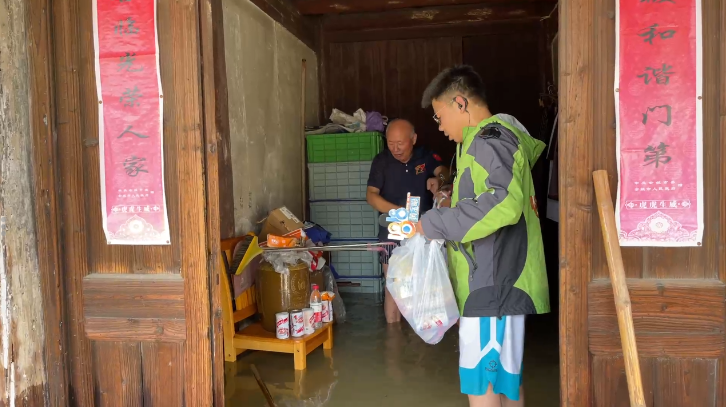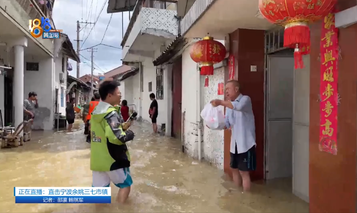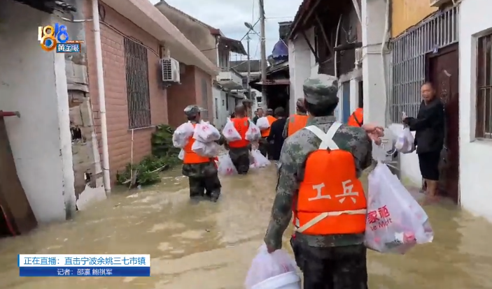 今天上午10点,记者来到三七市镇三七市村,此时路面的积水已没过大腿。宁波江北等地组织了160名民兵,正分批将皮划艇上的物资以徒步的方式一袋袋往需要的群众家里运送。