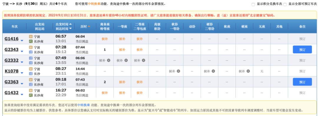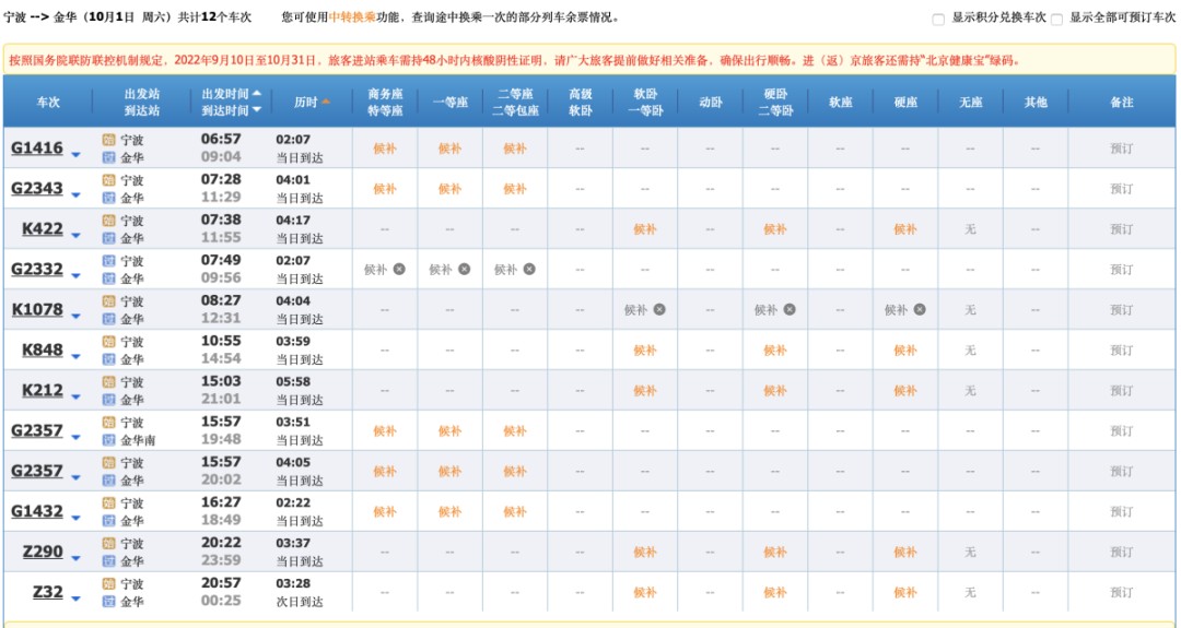 以宁波开往金华的12个车次为例,目前,9月30日、10月1日,这12个车次的车票已全部售罄。