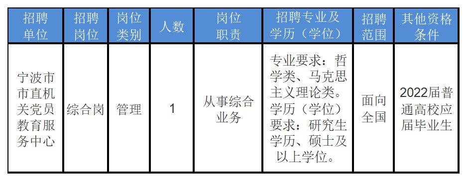 中共宁波市委直属机关工作委员会所属事业单位面向全国公开招聘事业编制工作人员1名。