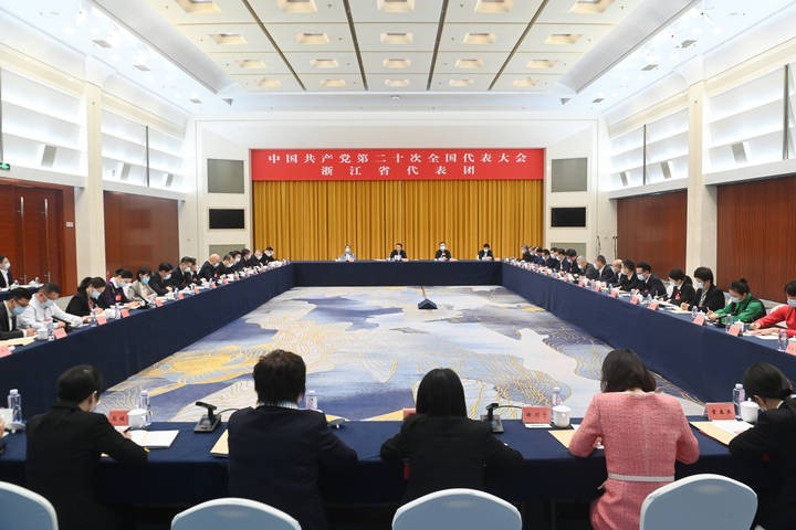 15日上午,党的二十大浙江代表团在驻地召开全体会议,传达学习党的十九届七中全会精神。