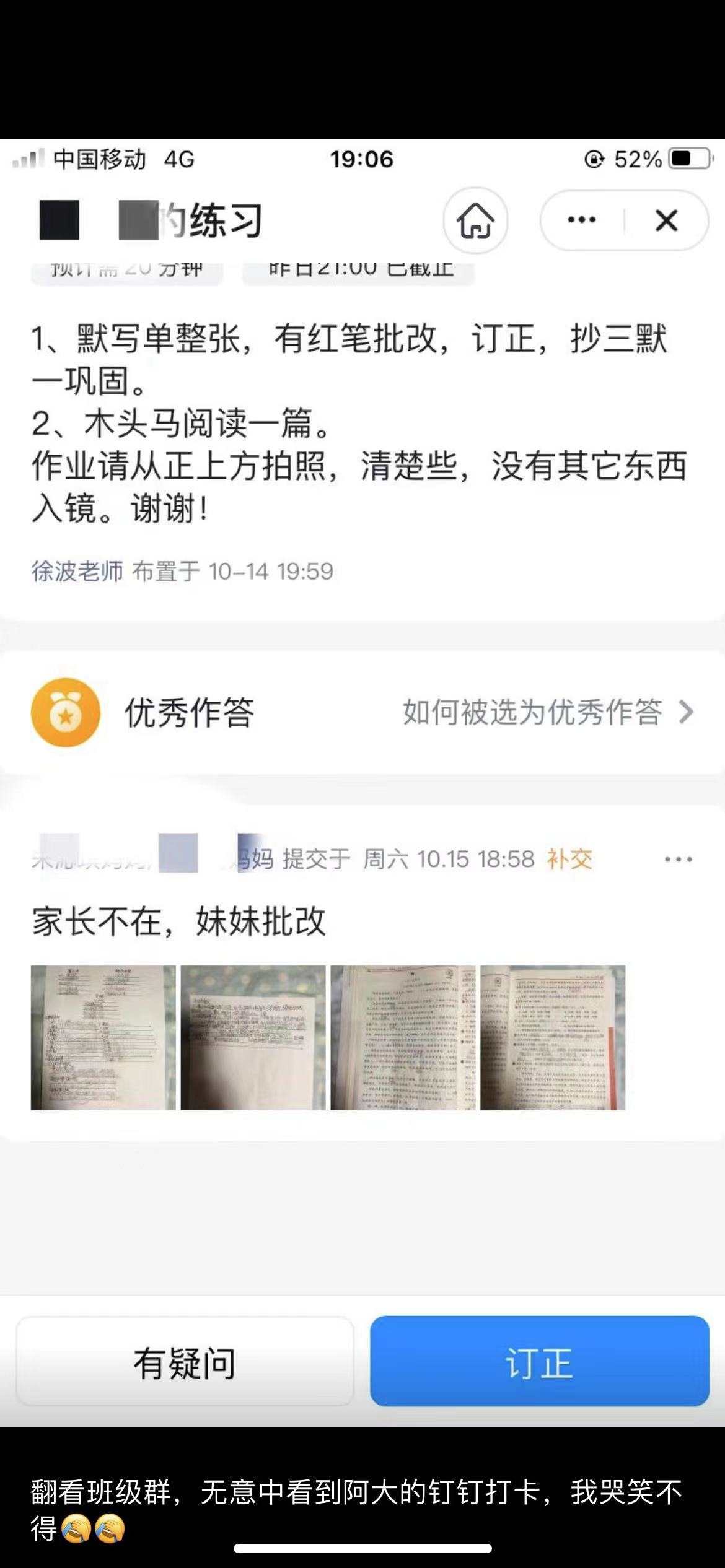 郑燕琳的朋友圈里晒了一张孩子的钉钉打卡记录,上面还备注着“家长不在,妹妹批改”八个字。