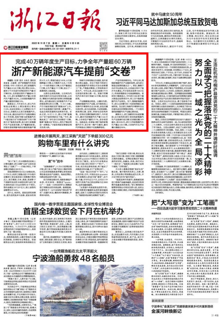 浙产新能源汽车传来好消息:今年1月至9月,浙江新能源汽车产量达41.62万辆,同比增长249%,提前3个月完成年初制定的年产量40万辆目标,且有望实现年产量超60万辆。9月,浙江新能源汽车产量占全省汽车产量的46.3%,占全国新能源汽车产量比重首次突破10%。