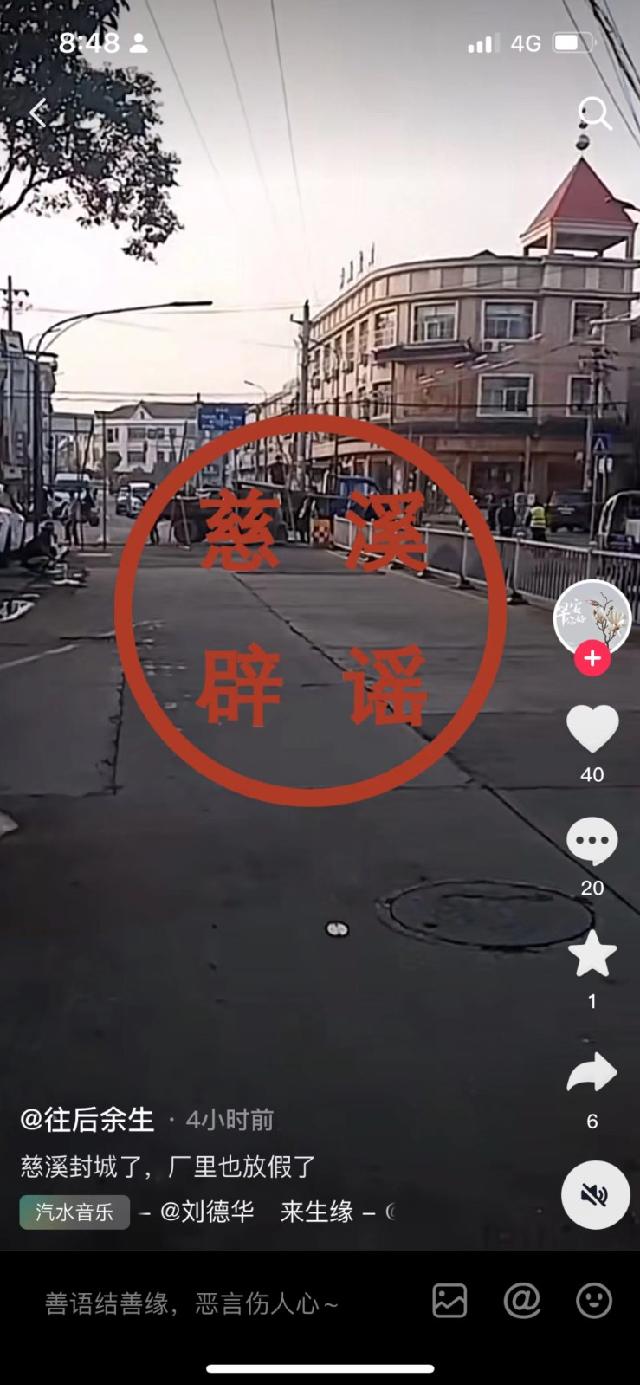 短视频平台上有内容显示“慈溪封城了,厂里也放假了”,经核实,此为不实消息。请广大网民朋友不信谣、不传谣!不散布传播相关不实信息!请关注官方平台。