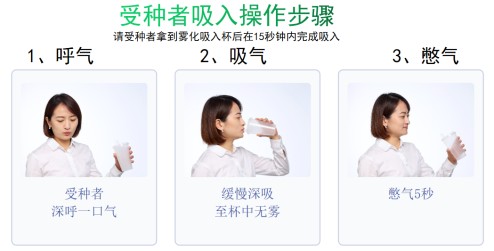 在接种时,工作人员使用专用的雾化给药装置,将疫苗雾化至雾化杯中,并将雾化杯递给受种者。受种者的吸入步骤可简单概括为三步:呼气、吸气和憋气。