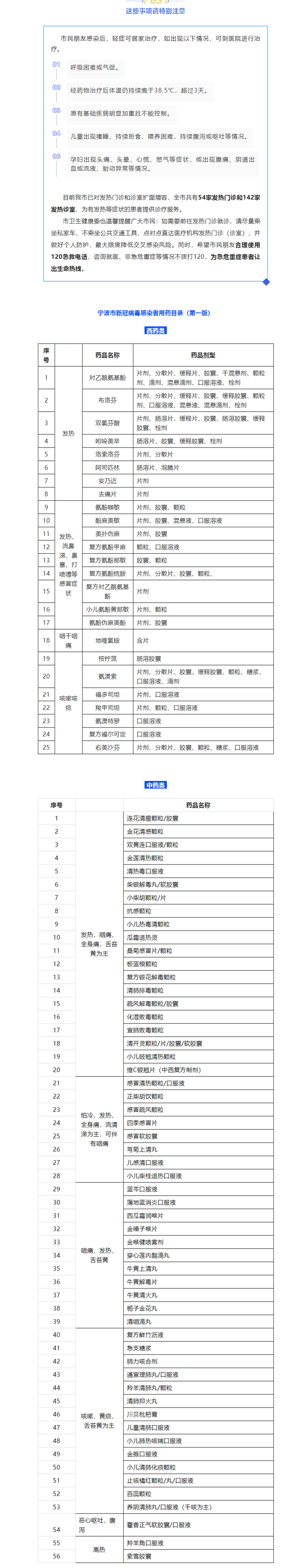 到底家里可以备什么药?宁波市卫生健康委组织药学、临床、中医专家结合我市气候特点,参考本轮疫情用药实际,论证了《宁波市新冠病毒感染者用药目录(第一版)》,现推荐给广大市民朋友。