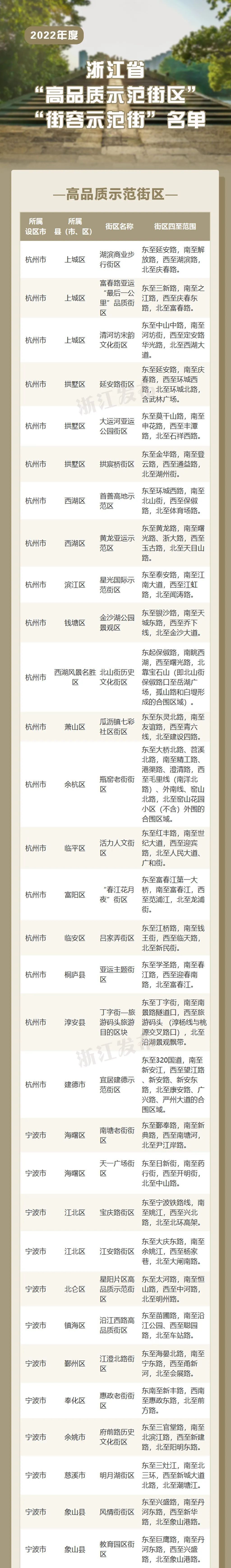 近日,省建设厅公布2022年度浙江省“高品质示范街区”“街容示范街”名单。其中,杭州市上城区湖滨商业步行街区等110个街区为“高品质示范街区”,杭州市上城区平海路(湖滨路—中河中路)等78个路段为“街容示范街”。宁波市12个街区,6个路段入选。