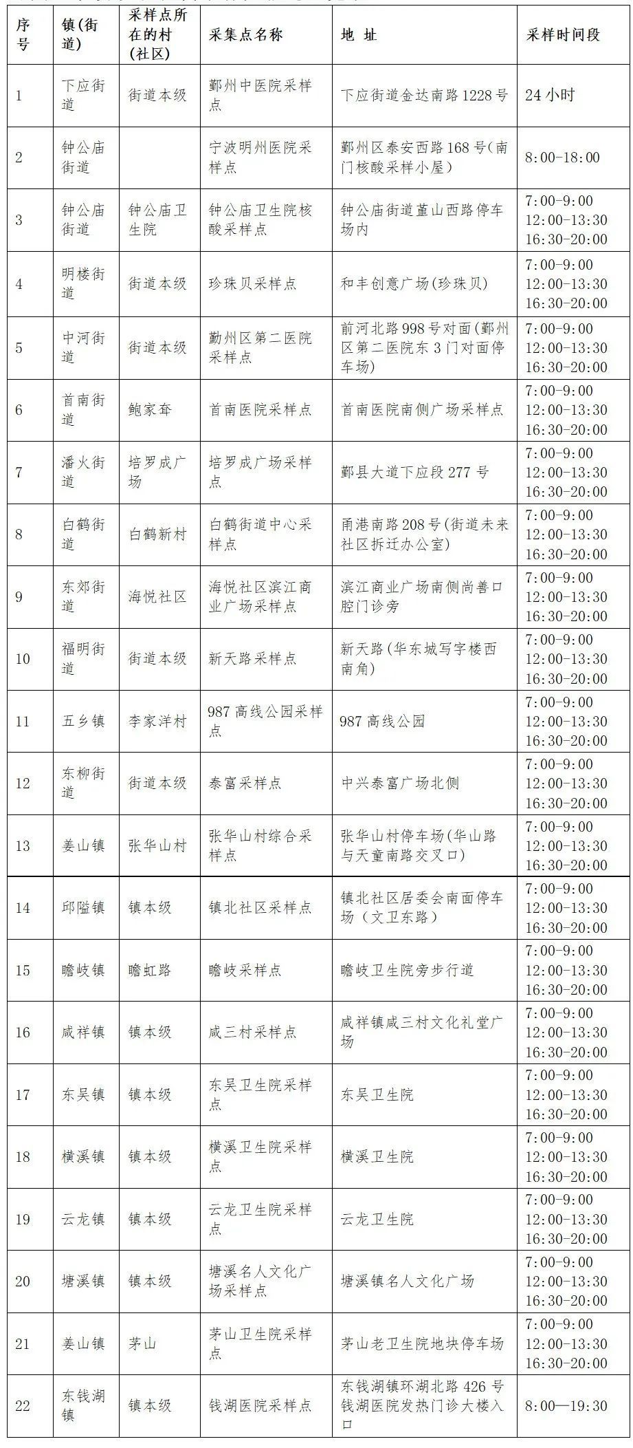 为深入贯彻上级有关“非必要不做核酸”的要求,自2023年1月9日零时起,鄞州区将关闭所有新冠病毒核酸免费采样点,保留22个自费单管核酸采样点(16元/人),具体采样点位信息详见下表。后续点位信息如有调整,请关注“鄞州发布”或“健康鄞州”。