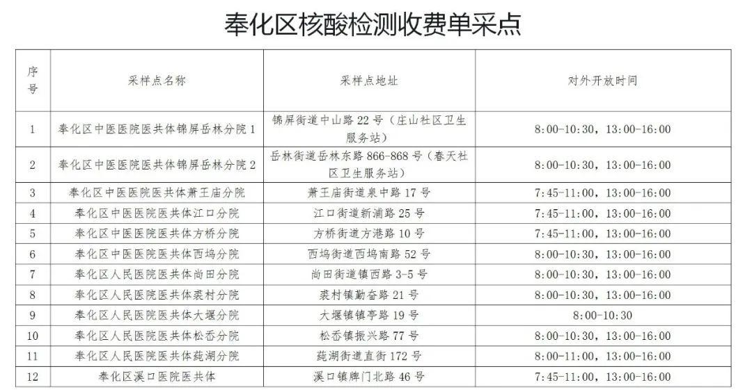 为深入贯彻上级关于“非必要不做核酸”的要求,自2023年1月5日零时起,将关闭奉化区所有新冠病毒核酸免费采集点,保留12个收费核酸采样点,采样只提供单人单管服务,并按16元/管收取费用。点位信息请见下表。