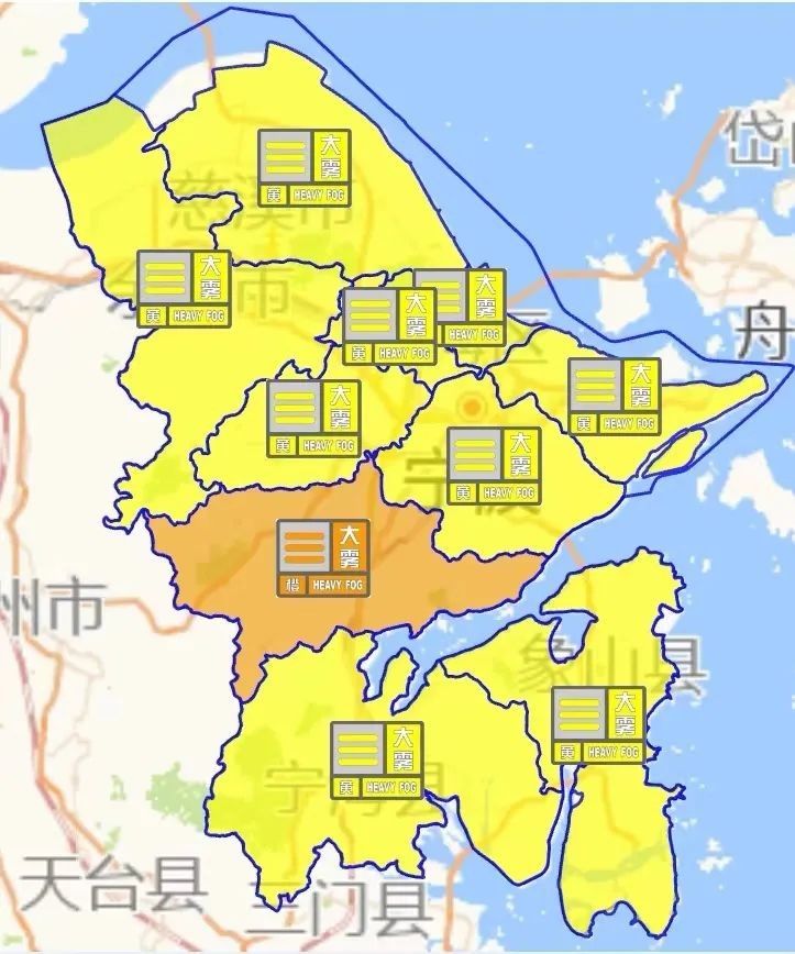 截至2月6日0时,海曙区、江北区、镇海区、北仑区、鄞州区、余姚市、慈溪市、宁海县、象山县发布大雾黄色预警信号,局部地区能见度将低于500米;奉化区发布大雾橙色预警,局部地区能见度将低于200米。请注意防范大雾对交通出行等带来的不利影响。